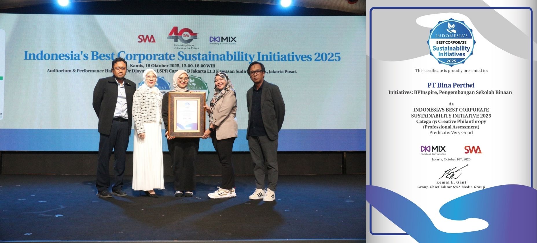 Penerimaan penghargaan ICSI 2025 oleh tim PT Bina Pertiwi (foto kiri). Sertifikat penghargaan kategori “Creative Philanthropy” dengan predikat Very Good (foto kanan).