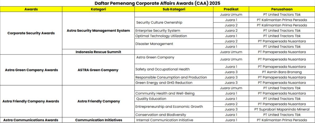 PT United Tractors Tbk (UT) bersama entitasnya PT Kalimantan Prima Persada (KPP), PT Pamapersada Nusantara (PAMA), PT Asmin Bara Bronang (ABB), dan PT Suprabari Mapanindo Mineral (SMM) kembali menorehkan prestasi dengan meraih 21 penghargaan dalam ajang Astra Corporate Affairs Awards (CAA) 2025. Penghargaan ini merupakan bentuk apresiasi atas keberhasilan Grup UT dalam mengimplementasikan Corporate Affairs Policy melalui pengembangan inovasi yang berkelanjutan. Ajang tersebut diselenggarakan oleh PT Astra International Tbk di Catur Dharma Hall, Menara Astra, Jakarta, pada tanggal (23/01/2026).