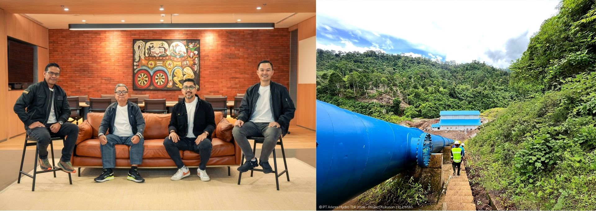 Board of Directors ARKO (foto kiri). Penstock-powerhouse PLTM Kukusan 2 (foto kanan).